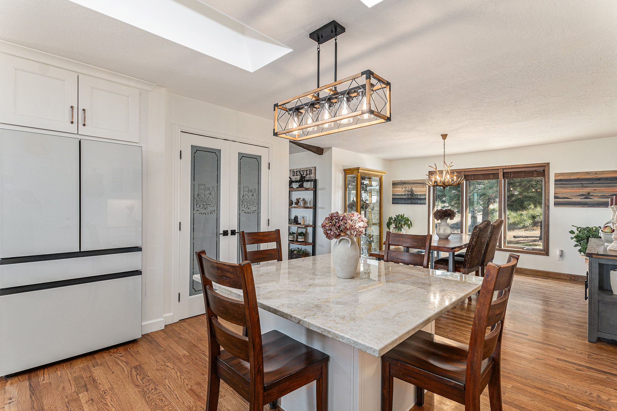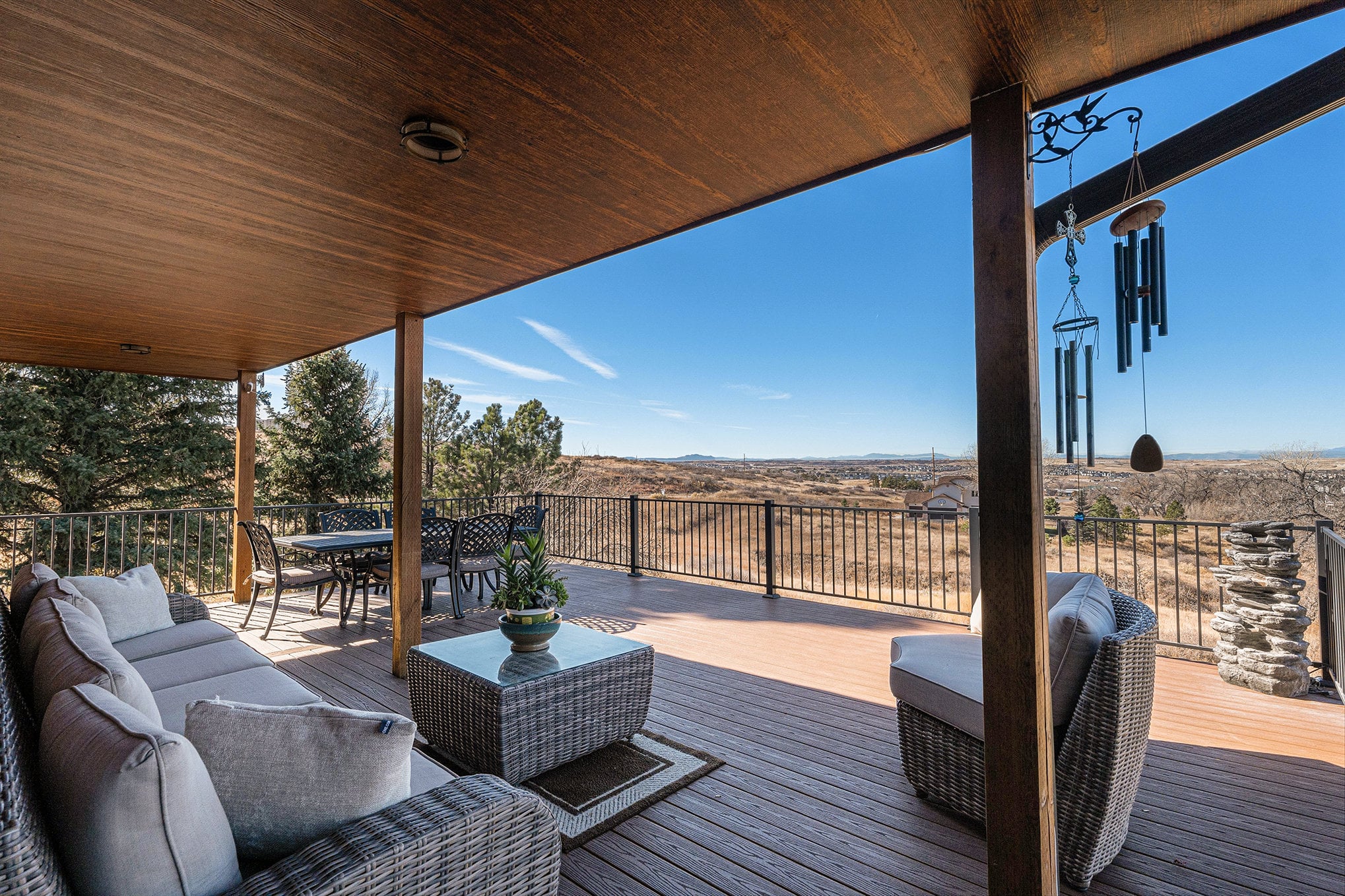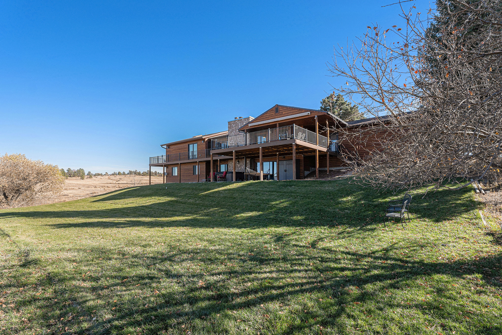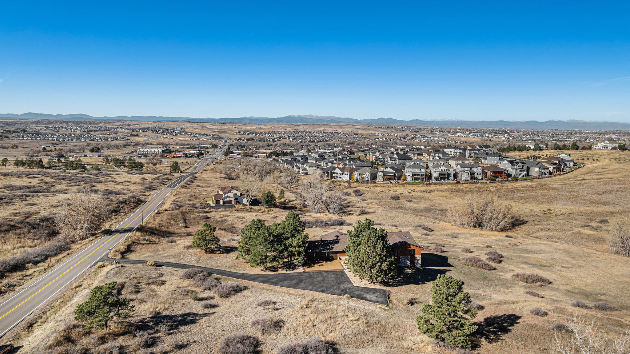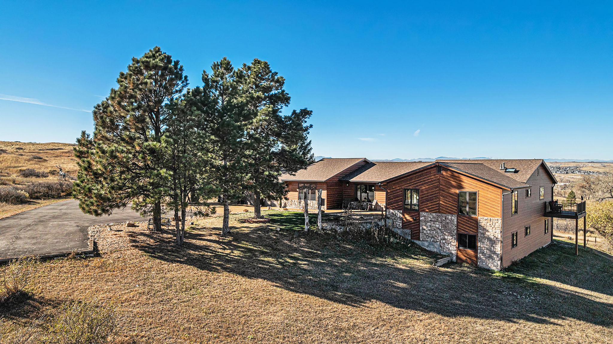 Welcome to your modern Colorado dream retreat with stunning Mountain Views! This fully remodeled ranch home perfectly balances mountain-inspired architecture with refined, contemporary living. Nestled on over 5 private acres in the coveted Butterfield neighborhood, this home offers the serenity of country living with the convenience of being just minutes from shopping, dining, and top-rated schools in Parker. A long paved drive lined with mature pines and a signature elk statue sets the tone as you approach this impressive estate. Step through the knotty alder wood front door to discover warm wood beams, vaulted ceilings, and stone accent walls that create a timeless mountain-modern feel. The completely remodeled kitchen is a showpiece with quartz countertops, a Samsung Bespoke refrigerator, and KitchenAid appliances, including a double oven. A coffee bar and two expansive islands for dining and entertaining complete the space, all framed by a large picture window showcasing mountain views. The living room features an electric fireplace installed over an original wood-burning fireplace, giving buyers the option to restore the classic wood-burning feature if desired, filling the space with warmth and charm. The primary suite opens to a wraparound deck with retractable awning and includes a spa-style bath with clawfoot tub, double-head shower, and heated floors. The walkout basement is an entertainer’s dream with a wet bar, beverage fridge, wood-burning fireplace, and custom wood paneling throughout. Additional upgrades include reverse osmosis filtration, sprinkler system, modern railings, and new composite decking, blending beauty with practicality. With over $100K in thoughtful improvements, this property embodies craftsmanship, comfort, and Colorado character. A rare sanctuary where modern elegance meets mountain soul.