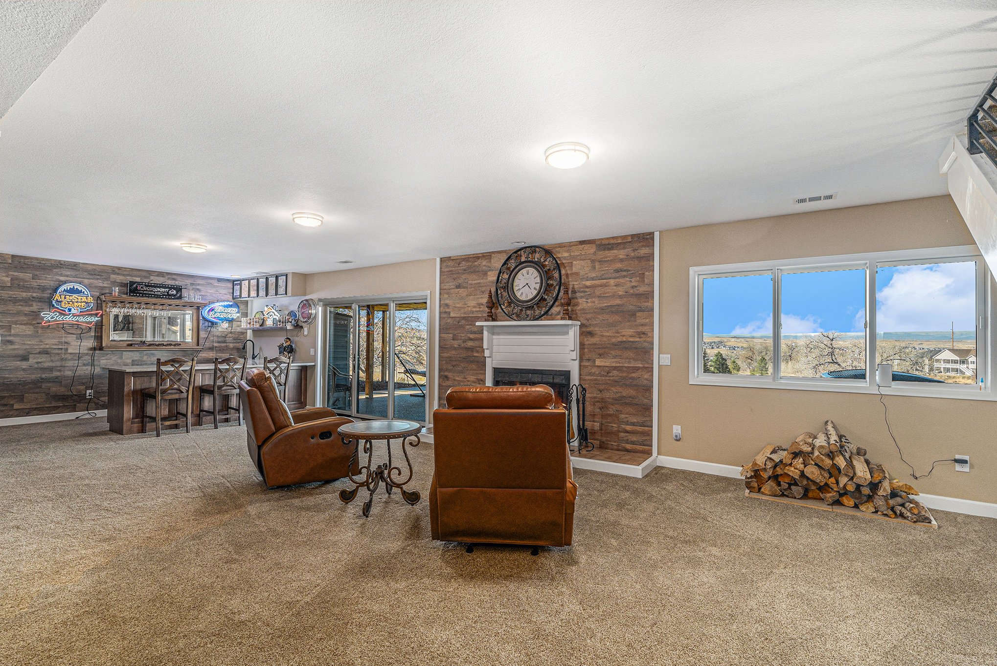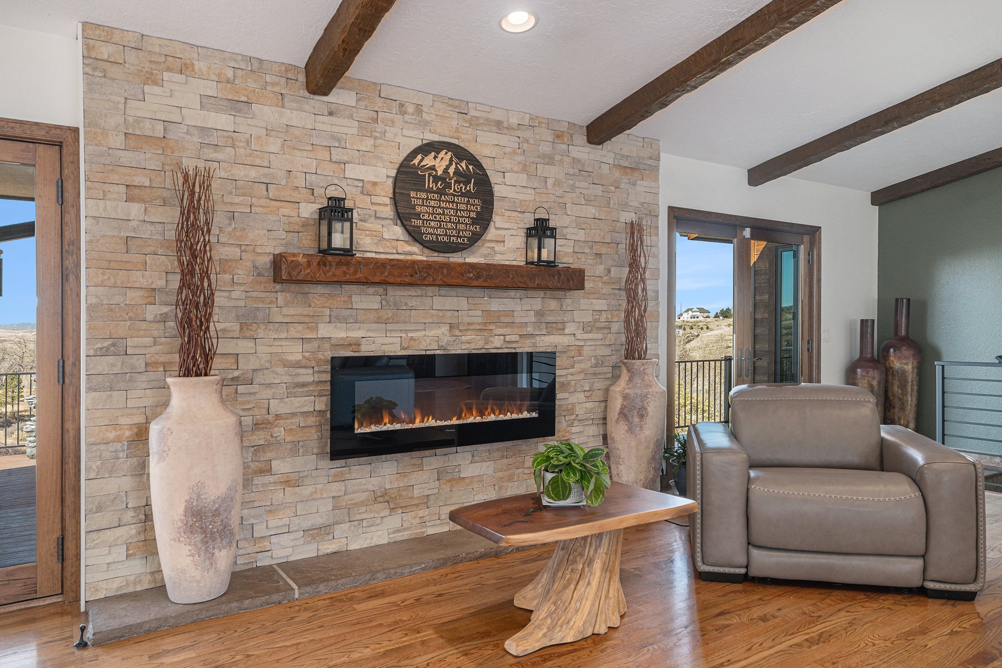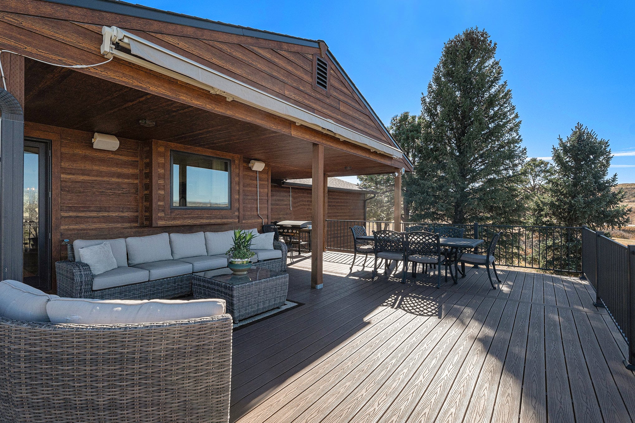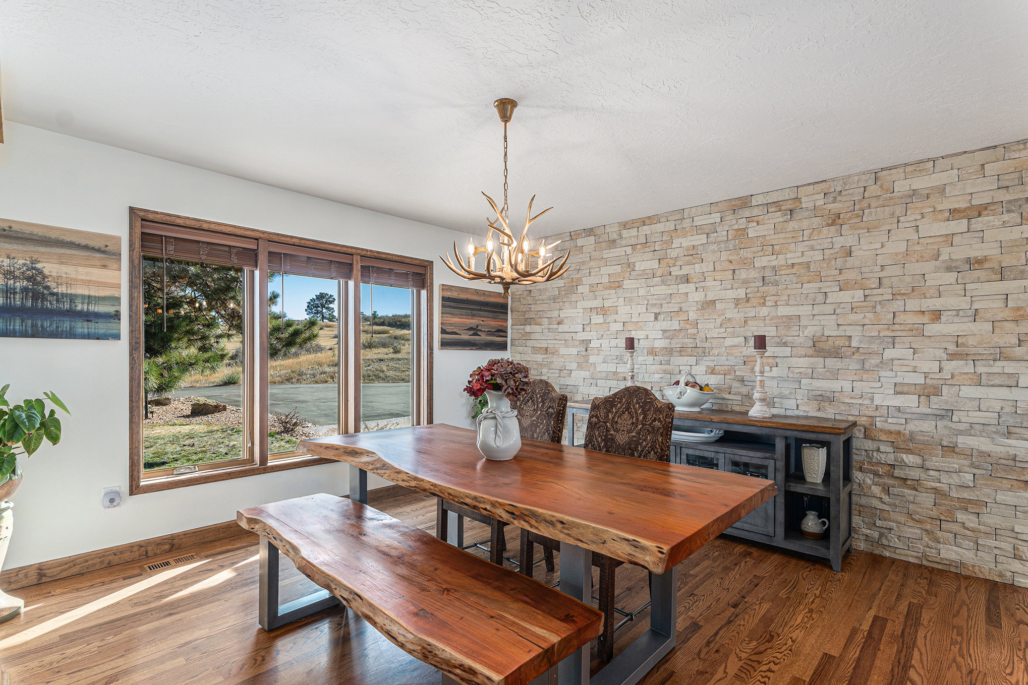 Welcome to your modern Colorado dream retreat with stunning Mountain Views! This fully remodeled ranch home perfectly balances mountain-inspired architecture with refined, contemporary living. Nestled on over 5 private acres in the coveted Butterfield neighborhood, this home offers the serenity of country living with the convenience of being just minutes from shopping, dining, and top-rated schools in Parker. A long paved drive lined with mature pines and a signature elk statue sets the tone as you approach this impressive estate. Step through the knotty alder wood front door to discover warm wood beams, vaulted ceilings, and stone accent walls that create a timeless mountain-modern feel. The completely remodeled kitchen is a showpiece with quartz countertops, a Samsung Bespoke refrigerator, and KitchenAid appliances, including a double oven. A coffee bar and two expansive islands for dining and entertaining complete the space, all framed by a large picture window showcasing mountain views. The living room features an electric fireplace installed over an original wood-burning fireplace, giving buyers the option to restore the classic wood-burning feature if desired, filling the space with warmth and charm. The primary suite opens to a wraparound deck with retractable awning and includes a spa-style bath with clawfoot tub, double-head shower, and heated floors. The walkout basement is an entertainer’s dream with a wet bar, beverage fridge, wood-burning fireplace, and custom wood paneling throughout. Additional upgrades include reverse osmosis filtration, sprinkler system, modern railings, and new composite decking, blending beauty with practicality. With over $100K in thoughtful improvements, this property embodies craftsmanship, comfort, and Colorado character. A rare sanctuary where modern elegance meets mountain soul.